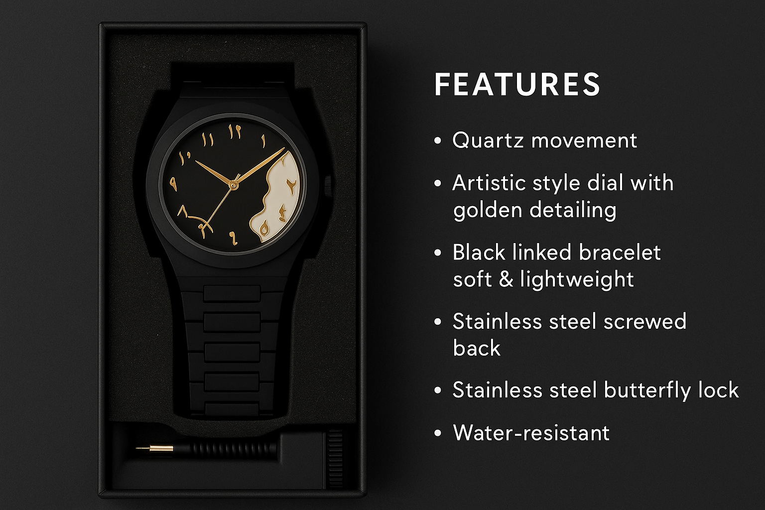 A stunning watch with a bold black design, Arabic numerals, and elegant hands that perfectly blend tradition with modern style. Crafted for comfort and durability, it’s more than a timepiece—it’s a statement.